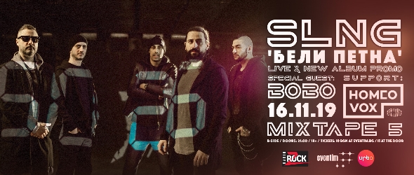 Група SLNG ще представи новия си албум "Бели петна" в малката зала на столичния клуб Mixtape 5 от 21.00 ч. на 16 ноември, събота. Излизането на българска продукция с по-твърдо звучене през последните години е рядкост и истинско събитие, което в конкретния случай ще бъде подкрепено с концерт, включващ емблематични хитове на SLNG и песни от нейния нов диск "Бели петна". За актуалния едноименен сингъл на сцената ще излезе и Бобо. Подгряват музикантите от Homeovox, соловия проект на Жоро Георгиев (Остава). Към днешна дата бандата е в състав: Владимир Михайлов - вокал и китари, Калин Петров – клавишни, Младен Несторов - Патето - бас, Петър Рангелов - китара и Алекс Лазаров - барабани. Албумът "Бели петна", който е трети пореден за SLNG след "Синьо" (2000 г.) и "Всеки ден" (2004 г.), съдържа 11 оригинални песни + 2 бонус трака. Вътре са "Фалшив" - първият сингъл, след като групата се събира повторно през 2012 г., както и последвалите "Където си ти", "Бъди" и последният "Бели петна" ft. Бобо. Проектът е записан и мастериран в студио "Пърфект рекърдс" в периода 2013 - 2019 с продуценти Чочо Петков (Perfect Records) и SLNG. Феновете ще могат да се сдобият с "Бели петна" още във вечера на концерта. Компактдискът ще бъде наличен на място на преференциална цена от 10 лв. Билети за концерта са налични в мрежата наEventimи URBO.