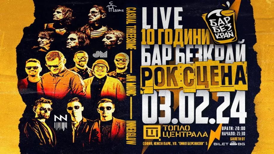 Innerglow, Casual Threesome и Jin Monic ще отбележат със специално послание "Предай нататък" десетия безкраен рожден ден на бара, който дава възможност на млади и непознати творци за развитие и рок-ен-рол спасение.